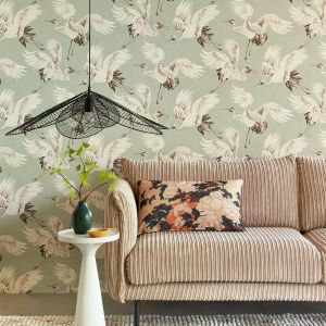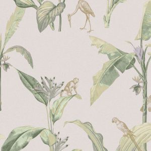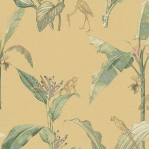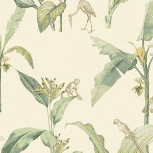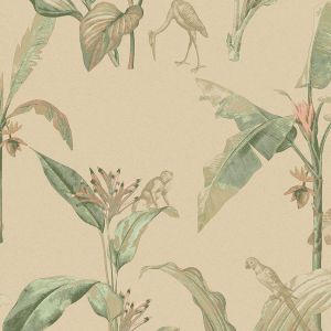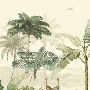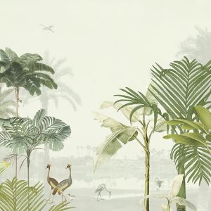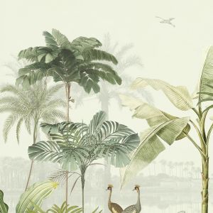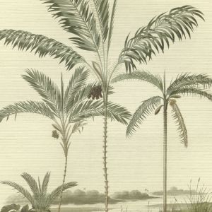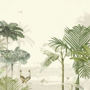 Свет, проникающий сквозь листву, отбрасывает тени на тонкую полосатую поверхность. Солнечный «toile de jouy» с леопардами и тиграми, блуждающими по ландшафту, стая журавлей летает по стене, а металлические животные мерцают среди пальмовых листьев. Крупномасштабный графический мотив пальмы прекрасно сочетается с тонким текстильным фоном, веерообразный дизайн которого вдохновлен листьями гинкго. Живописные стены украшают пышная лагуна, старинные пальмы и рай, где можно расслабиться и расслабиться. Теплые, загорелые тона идеально гармонируют с успокаивающей прохладной палитрой воды и зелени.